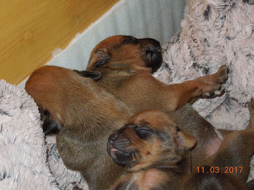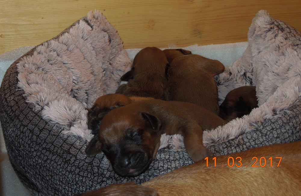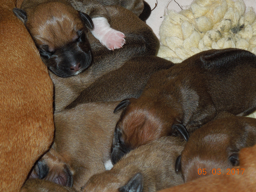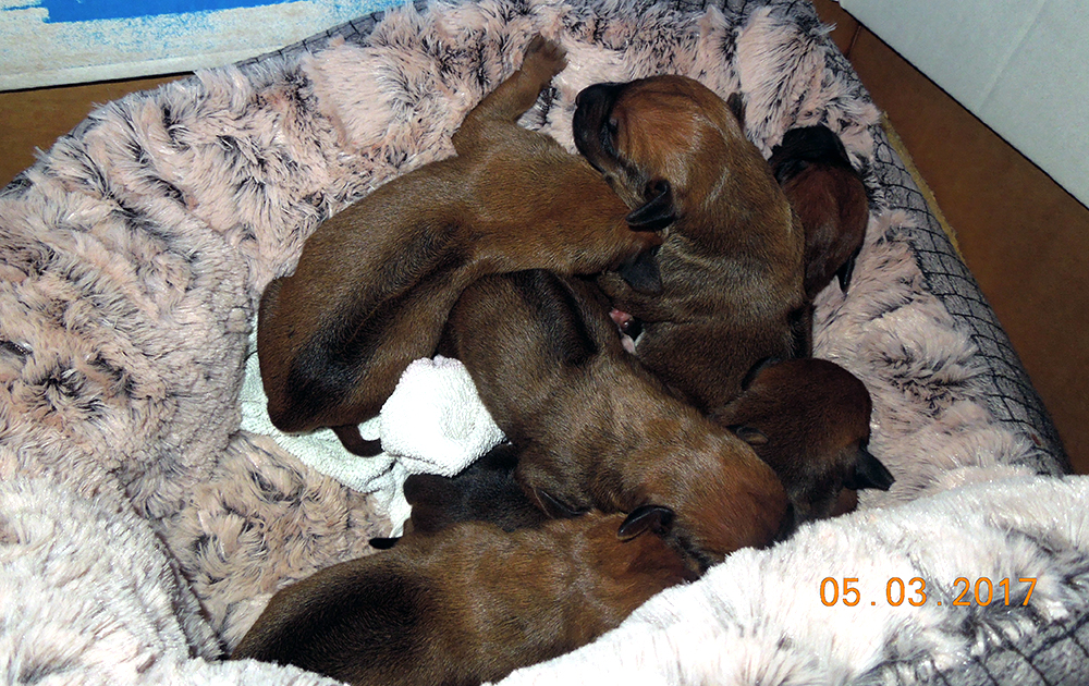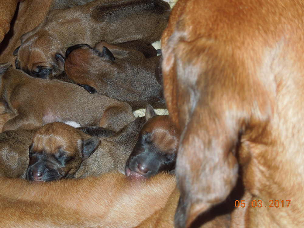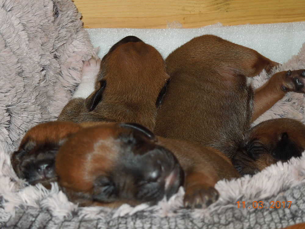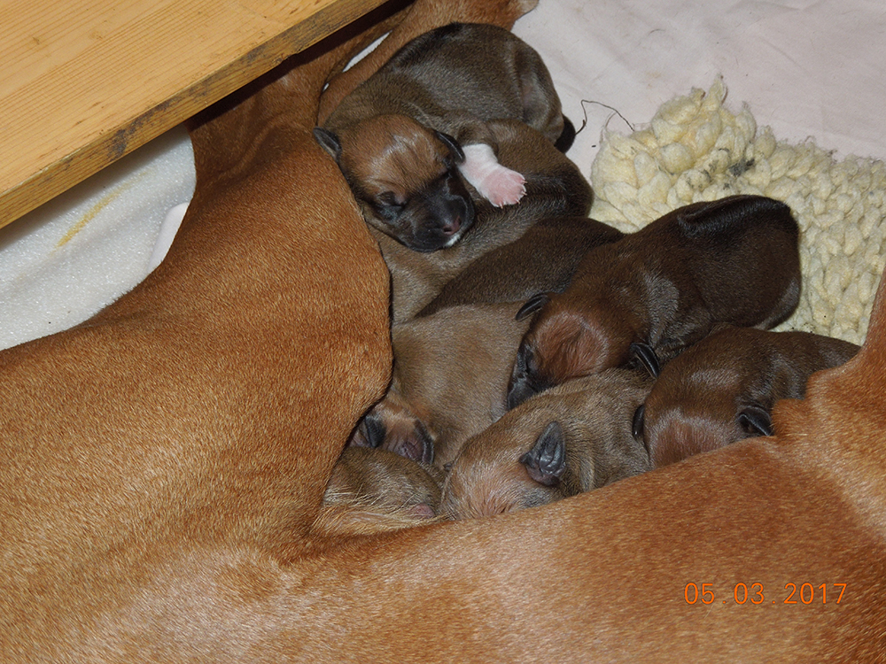 Am 05.03.2017 pünktlich 0.00 Uhr (es sollten gern Sonntagskinder werden) kamen die 4 jungen Damen und 4 Herren des "G-Wurfes" ans Licht dieser Welt und begleiteten subito warm und trocken verpackt ihre Mama auf dem Weg in die Klinik, um dort feststellen zu lassen, dass das Rudel mit ihnen komplett sei."