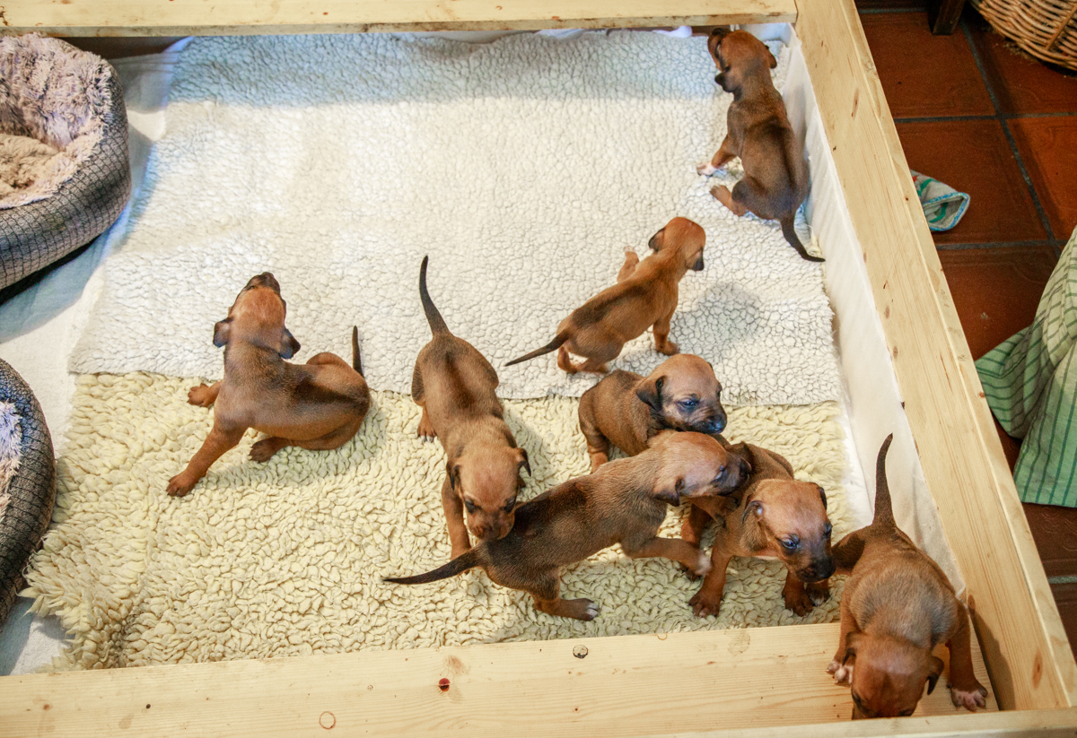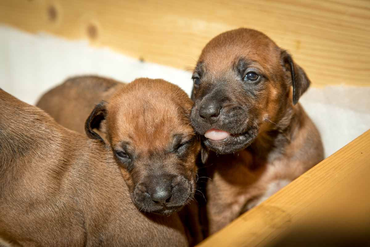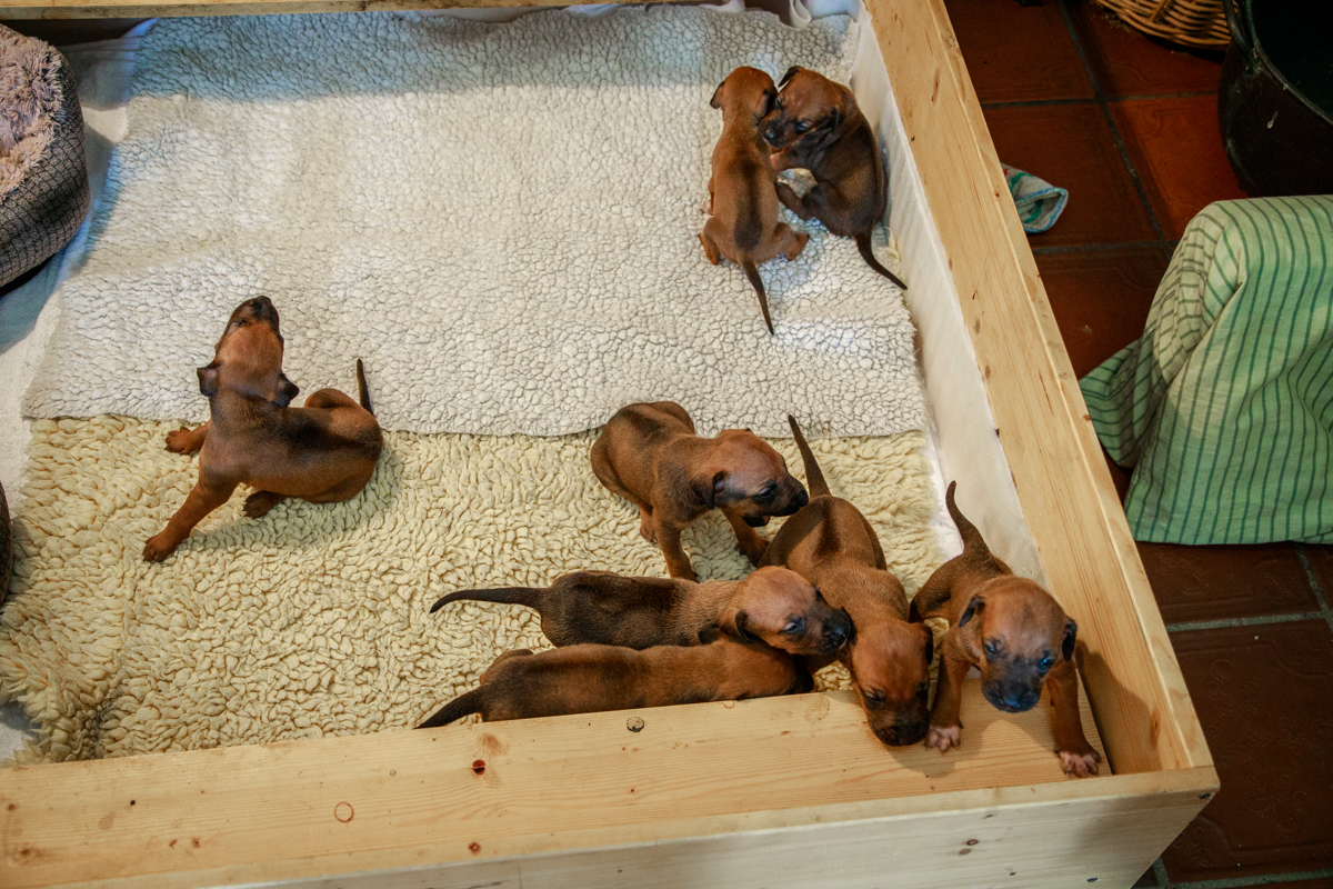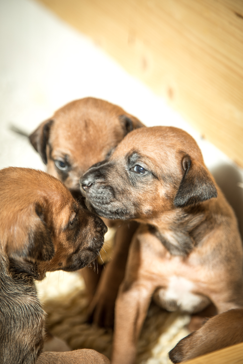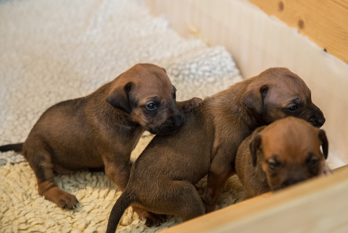 Nachdem unsere liebe Hunde-Paparazzi-Fotografin Danny , sich von einem schweren grippalen Infekt einigermassen erholt hat, hat sie einmal mehr zauberhafte Bilder der kleinen Rasselbande gefertigt, die nun mit weit und interessiert geöffeneten Äuglein und Öhrchen fröhlich durch die Wurfkiste torkeln, sich gegenseitig die zahnlosen Kiefer ins Fell schlagen, und sich schon heftig mit Ausbruchsplänen beschäftigen.  Ich denke, wir müssen alsbald umziehen, damit es kein Malheur gibt, wenn sie der Kiste den Rücken kehren.