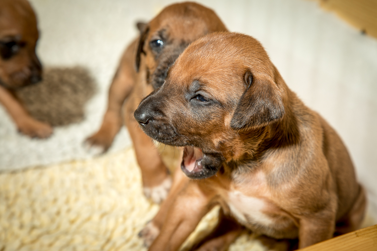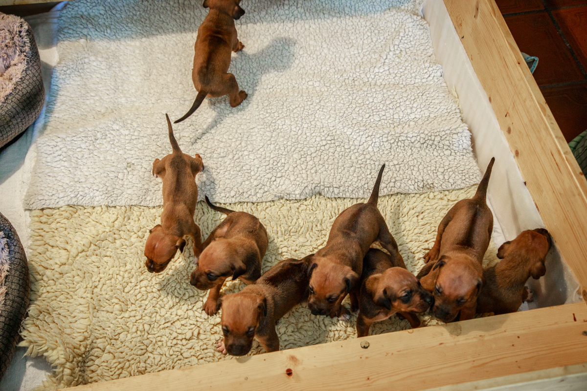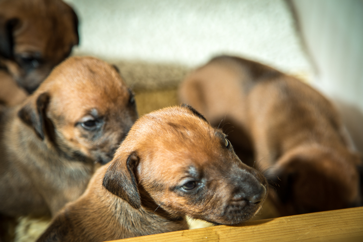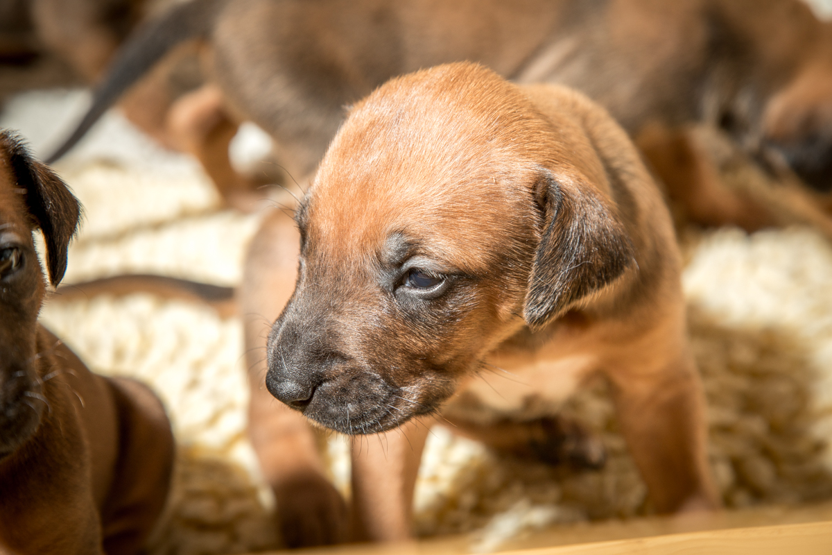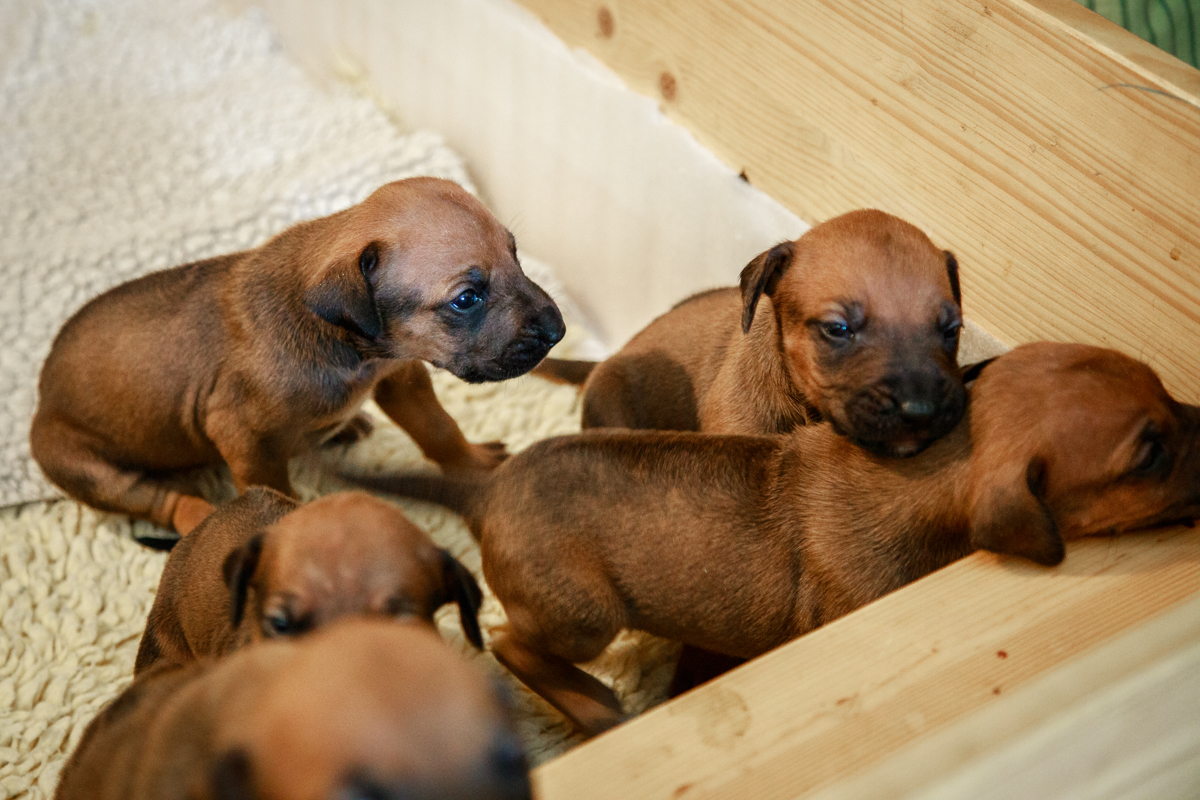 Nachdem unsere liebe Hunde-Paparazzi-Fotografin Danny , sich von einem schweren grippalen Infekt einigermassen erholt hat, hat sie einmal mehr zauberhafte Bilder der kleinen Rasselbande gefertigt, die nun mit weit und interessiert geöffeneten Äuglein und Öhrchen fröhlich durch die Wurfkiste torkeln, sich gegenseitig die zahnlosen Kiefer ins Fell schlagen, und sich schon heftig mit Ausbruchsplänen beschäftigen.  Ich denke, wir müssen alsbald umziehen, damit es kein Malheur gibt, wenn sie der Kiste den Rücken kehren.